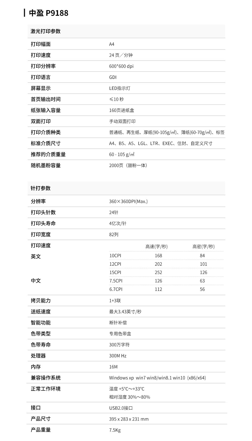 产品类型:多功能一体机 产品型号:中盈P9188 产品特征:创新设计——激光、针式一机两用 节省空间 精湛技术——1+3联复写能力 清晰打印发票、二维码 卓越品质——打印头寿命高达4亿次/针 外观小巧——全新设计理念体积小巧美观 高效打印——色带寿命高达400万字符